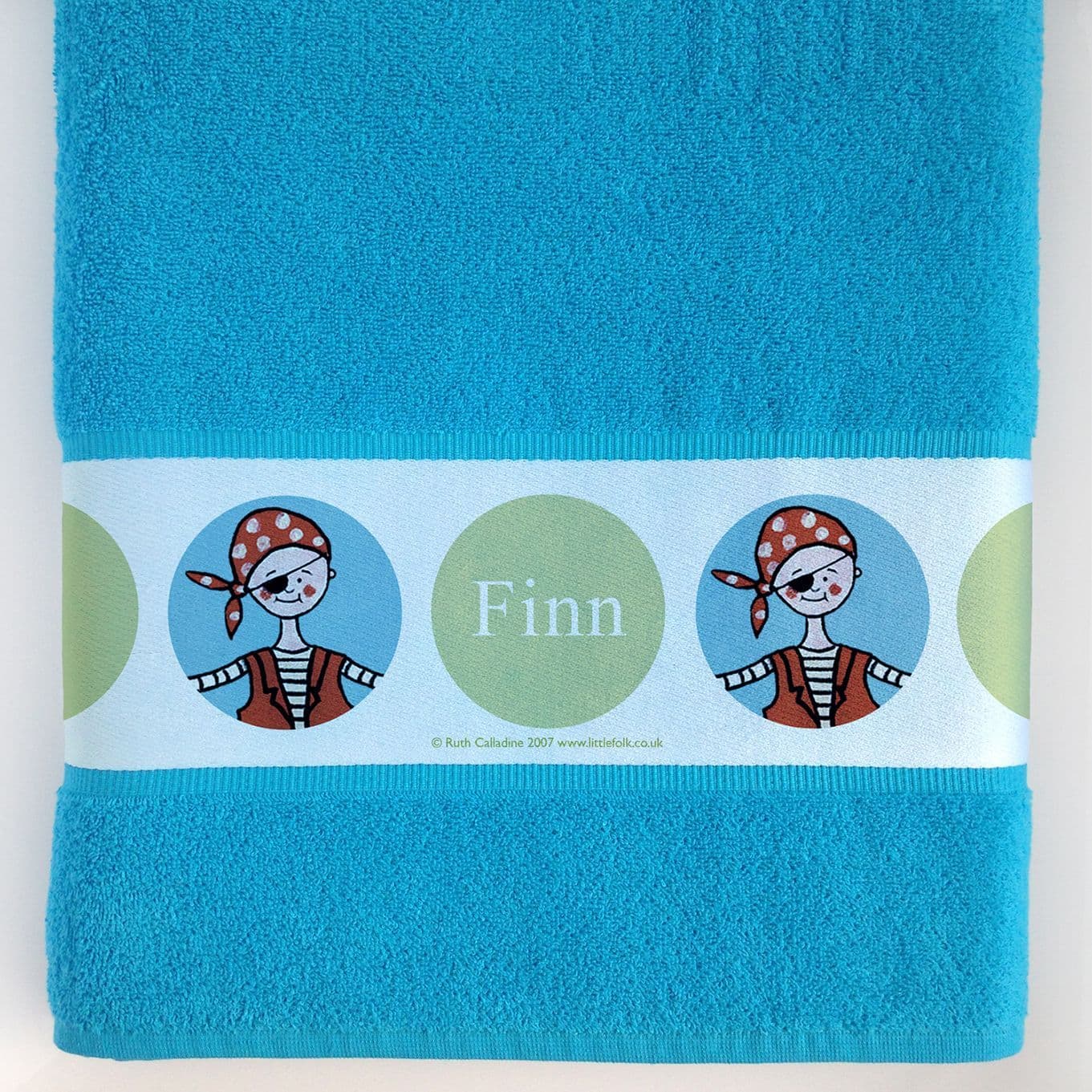 A personalised large towel featuring the Pirate Dots from Little Folk. These super soft Turkish cotton towels are all individually personalised and printed for your boys and girls. They're great for using at home or at the beach and swimming pool, too.