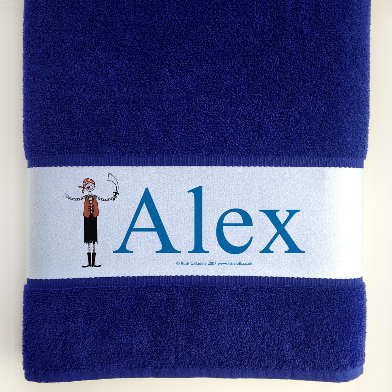 A personalised large towel featuring Plank the Little Pirate from Little Folk. These super soft Turkish cotton towels are all individually personalised and printed for your boys and girls. They're great for using at home or at the beach and swimming pool, too.