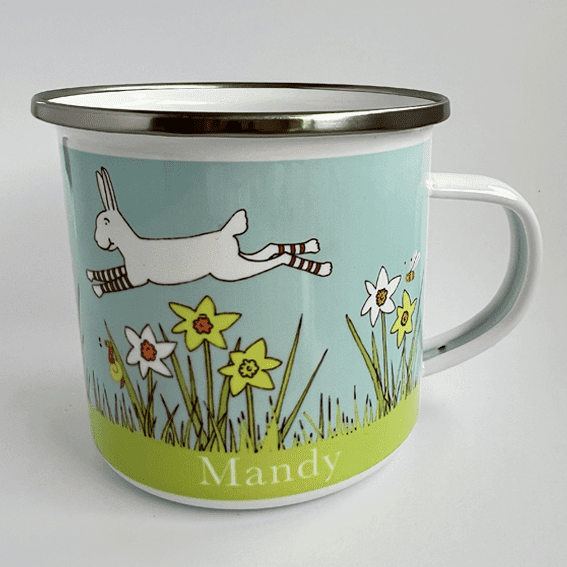 A personalised Springtime enamel cup from the Little Folk Easter range. The design wraps around the mug and features Hop the Little White Hare leaping over daffodils.