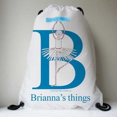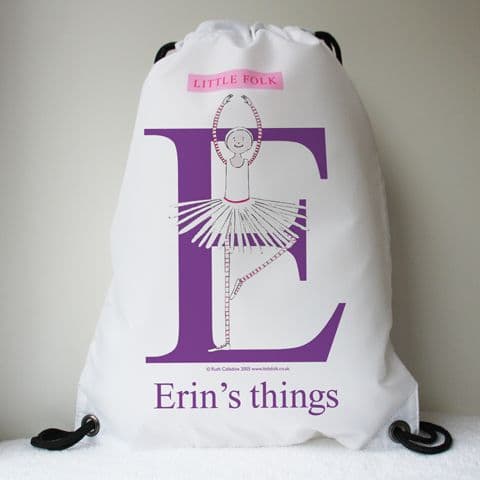 A personalised swimming bag or personalised ballet bag by Little Folk. This personalised childrens drawstring swimming bag is lightweight and features Twirl the Little Ballerina. It can be personalised with your child's name and favourite colour.