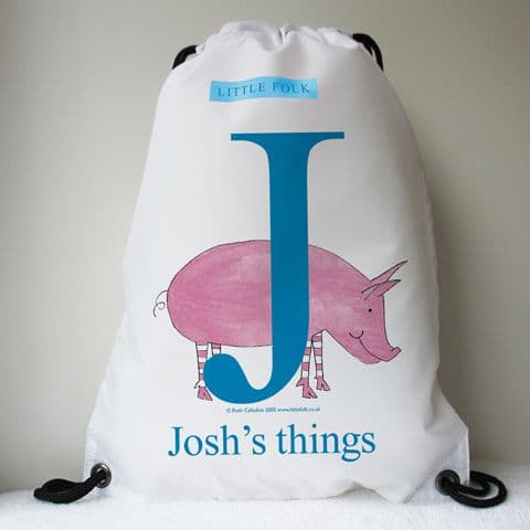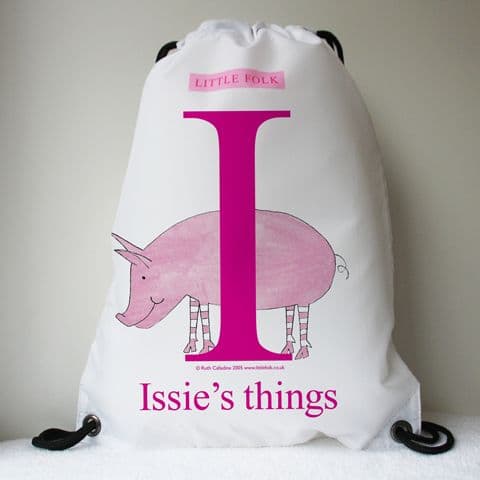 A personalised swimming bag by Little Folk. This children's lightweight drawstring swimming bag features Oink the Little Pig. It can be personalised with your child's name and favourite colour.