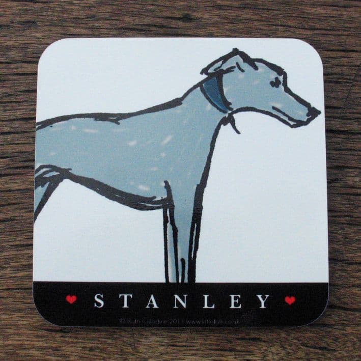 The standard wording on the black band reads WHIPPET but could be changed to a name of no more than 12 characters, for example, STANLEY. All of the cups and coasters are individually hand printed.