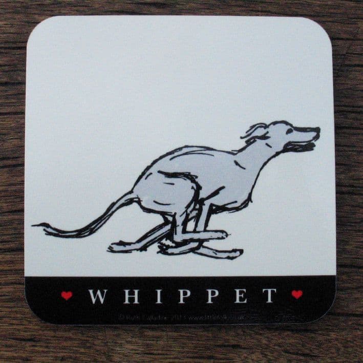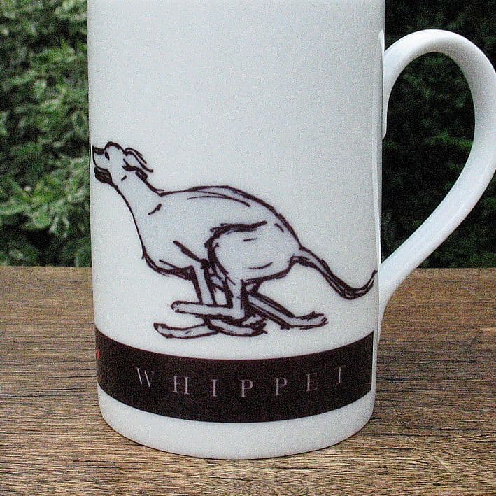 The standard wording on the black band reads WHIPPET but could be changed to a name of no more than 12 characters, for example, WILLOW. All of the cups and coasters are individually hand printed.