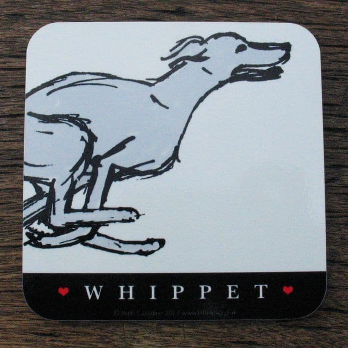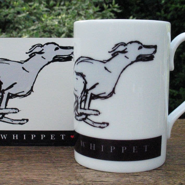 The standard wording on the black band reads WHIPPET but could be changed to a name of no more than 12 characters, for example, WILLOW. All of the cups and coasters are individually hand printed.