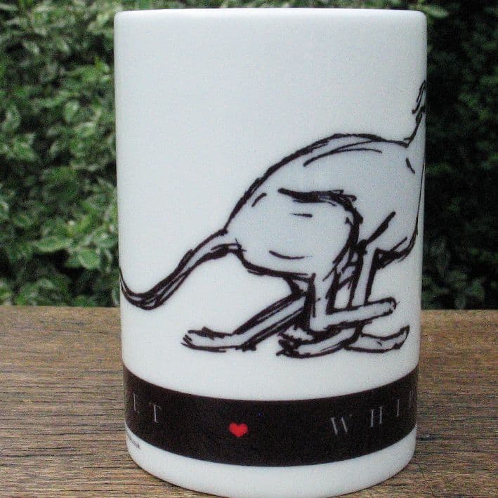 A hand printed whippet mug and matching coaster by Ruth Calladine. A lovely illustration of a running whippet which wraps around a glossy white porcelain mug and across a coaster. A tiny red heart punctuates the black band and wording.
