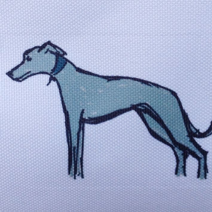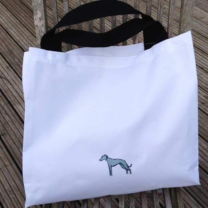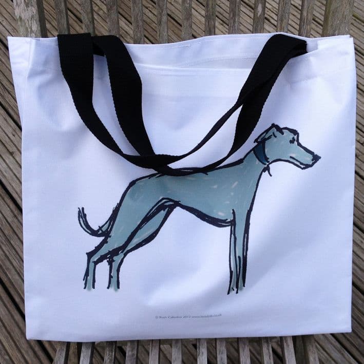 A hand printed stylish Whippet shopping bag which is also useful for a beach bag or for keeping all of your dog's things together. Featuring the posing whippet from the Whippet Range by Ruth Calladine. It makes a pretty gift for a whippet or dog lover.