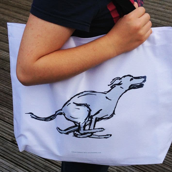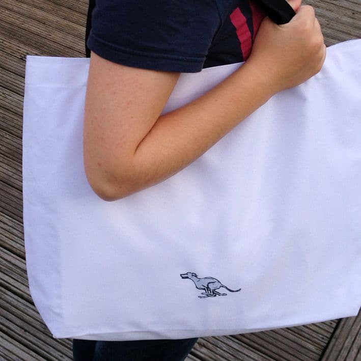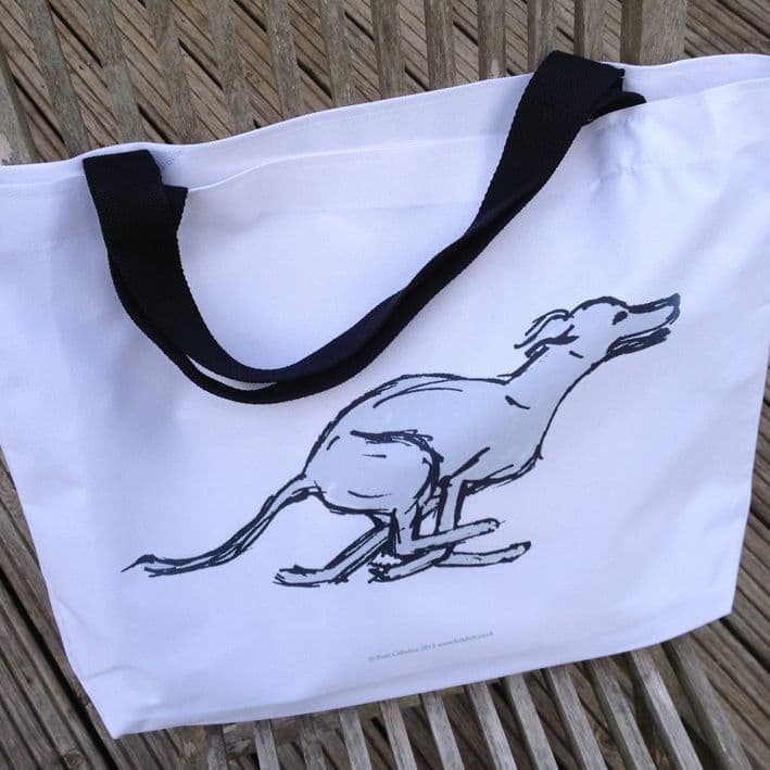 A hand printed stylish Whippet shopping bag which is also useful for a beach bag or for keeping all of your dog's things in. Featuring the running whippet from the Whippet Range by Ruth Calladine. It makes a pretty gift for a whippet enthusiast or dog lover.